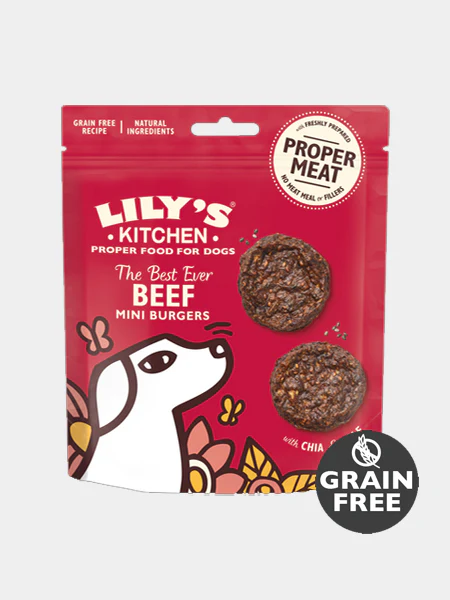 Les friandises sans céréales pour chien Mini burgers au bœuf de Lily’s Kitchen sont composé à 80% de viande de boeuf. Les friandises sont préparées à partir de bœuf frais, parsemées de graines de chia (contenant des oméga 3, réputés bons pour le pelage et la fourrure) et agrémentées de chou kale (bourré d’antioxydants). C’est la friandise idéale pour récompenser ou simplement faire plaisir à votre chien de façon saine et délicieuse.