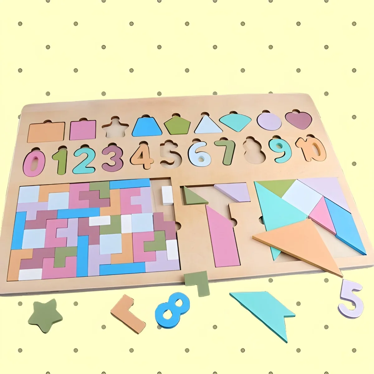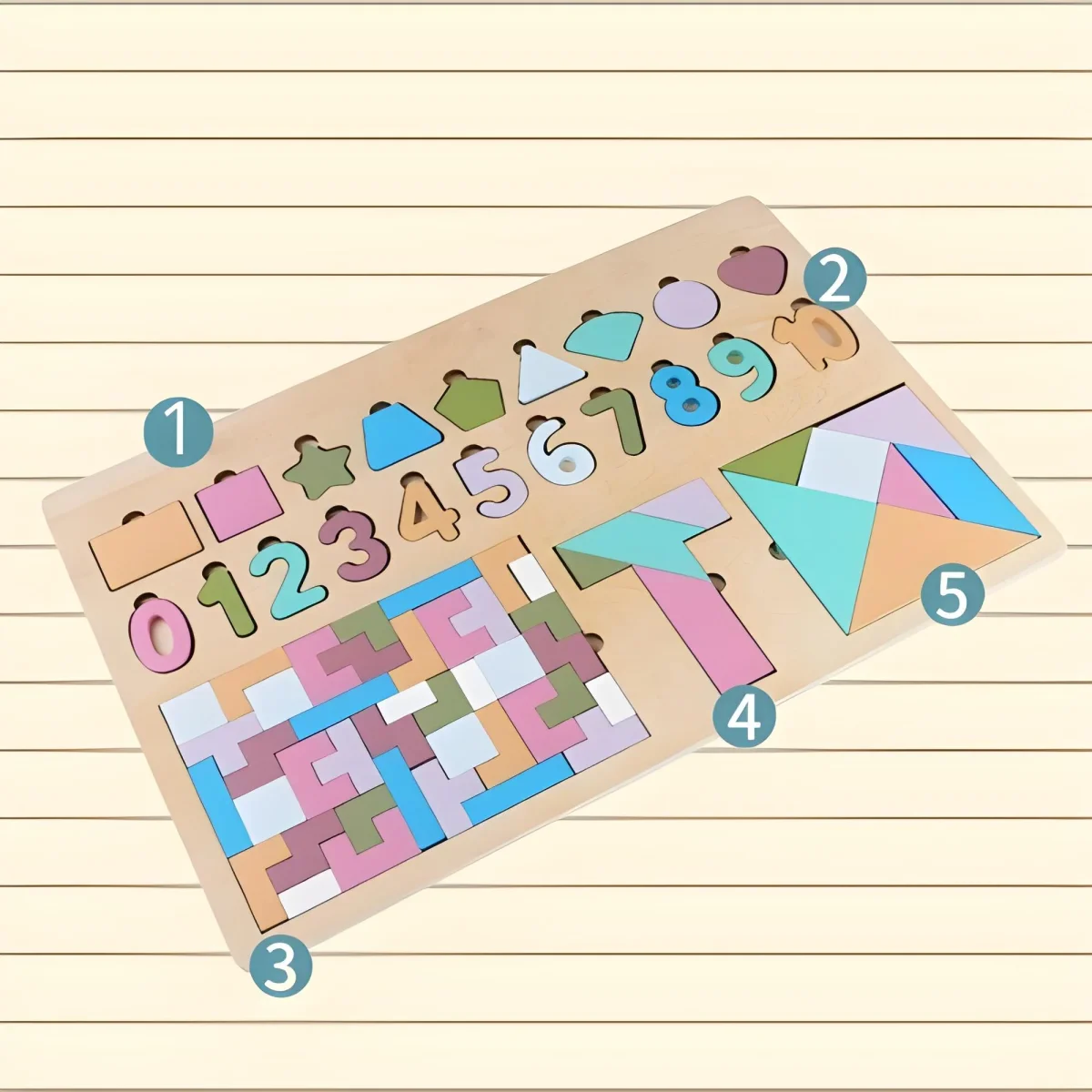 🧩 Puzzle éducatif 5-en-1 : 45×30 cm en bois pour développer formes, chiffres et logique.